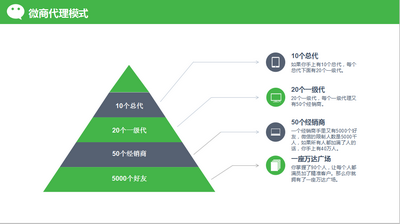 这一个微商运营模式的第一种,代理模式。通过上图可以看出,如果你能掌握总代理、一级代理、经销商这一流程中的90个人,你等于拥了一座二级城市的万达广场的人流量。这是目前运营模式中流水量最高的模式,常见的运营商品是面膜、彩妆、护肤等。这种模式一般都是发展到一二三代,是集中管理的模式,也是非常高效的模式。