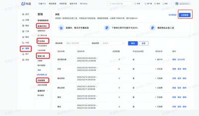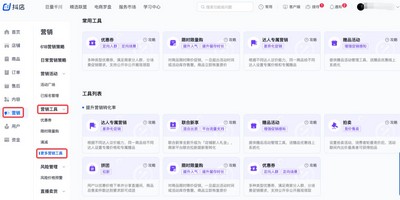 首先,新版抖店一站式配置营销玩法,商家点击“营销”菜单即可展开直播间活动/平台活动的报名入口,并可灵活搭配使用多种营销工具。