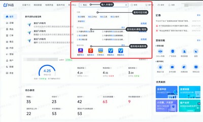 改版后,商家可以在后台首页顶部中心区域的搜索框,输入需要查找的功能关键词,例如“售后”,搜索框下会展示包含“售后”关键词的功能、课程学习/平台规则,以及服务市场的售后相关服务。