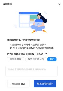 如果商家认为新界面不符合自身的使用习惯,或者存在其他使用问题,商家还可以点击新版本左侧导航栏下方的“返回旧版”,点击后仅当前帐号会切回旧版本,不影响同一店铺的其他子账号。