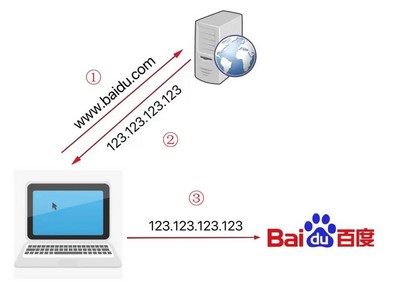 比如访问 www.baidu.com 这个域名,假设所在服务器的 IP地址是123.123.123.123。我们用浏览器访问该网页的时候,在敲完这串域名并按回车的时候,浏览器后台会先到 DNS 服务器找 www.baidu.com 对应的IP地址123.123.123.123,然后通过 123.123.123.123 这个 IP地址建立实际的网络连接和访问,这时候我们的网页才能加载出来。
