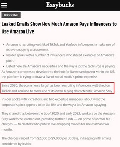 根据市场研究机构Insider的一份新报告,自2020年以来,Amazon Live团队一直在与拥有大量粉丝的TikTok和YouTube用户接触,提供的报价从每月2,000美元到9,000美元不等,根据用户的关注者数量以及他们在Amazon Live上可能带来的收入而确定。