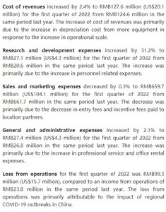 2022年第一季度,营收成本从去年同期的1.246亿元人民币增至1.276亿元人民币,增长2.4%。收入成本增加的主要原因是由于业务规模增加,设备增加,折旧成本增加。