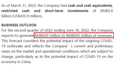 展望未来,截至2022年6月30日的2022年第二季度,公司预计实现营收6.6亿元至6.9亿元人民币。
