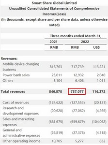 其中,移动设备充电业务收入从2021年同期的8.168亿元人民币下降至7.177亿元人民币,降幅为12.1%。充电宝销售收入从2021年同期的2500万元人民币下降到1290万元人民币,降幅达48.3%。其他收入(主要包括广告服务和新业务计划收入)从2021年同期的510万元人民币增长到640万元人民币,增长了25.5%。