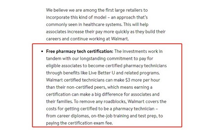 沃尔玛称,这些投资与该公司长期以来的承诺相一致,即通过Live Better U和相关计划等福利,支付合格员工成为认证药房技术人员的费用。沃尔玛认证的技术人员每小时可以比未经认证的同行多赚3美元,这意味着获得认证可以对员工及其家人产生重大影响。为了消除任何障碍,沃尔玛承担了获得药学技术人员认证的费用——从职业文凭、在职培训和考试准备,到支付认证考试费用。