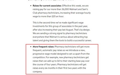 沃尔玛表示,药剂师将获得更频繁的自动加薪,因为我们引入了一种新的、渐进式的工资模式,旨在让我们在竞争中脱颖而出。例如,新的药房技术人员在四年内获得的加薪最多可以使他们的起始基本工资增加4美元。药剂师在公司工作的头两年每六个月都会获得一次加薪。