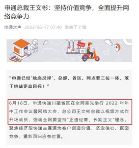 6月17日消息,据申通之声官微消息,日前,申通快递川藏省区在全网率先举行2022年年中工作会议暨网络大会,总公司王文彬总裁以视频方式作开场动员。