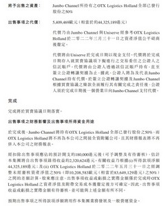 公告显示,于完成后,Jumbo Channel将持有OTX Logistics Holland全部已发行股份之50%,而OTX Logistics Holland将不再为本公司之间接全资附属公司,且其财务报表将不再并入本公司之财务报表。