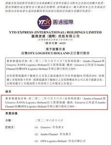 6月17日消息,圆通速递国际6月16日晚间在港交所发布公告称,公司的间接全资附属公司Jumbo Channel Limited与 Uniserve Holdings Limited及OTX Logistics Holland 订立买卖协议,据此,Uniserve已同意自Jumbo Channel收购OTX Logistics Holland全部已发行股份的50%,代价约为4432.52万港元。