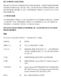 公告还显示,Jumbo Channel为一家于英属维尔京群岛注册成立的公司,並为本公司的间接全资附属公司。其主要从事投资控股。Uniserve主要从事物流服务。Uniserve由Uniserve的单一最大股东Iain Robert Liddell先生最终拥有超过99%权益。Uniserve及其最终实益拥有人均为独立于本公司及其关连人士的第三方。