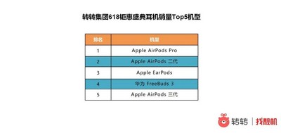 转转618战报显示,平台耳机销量Top5机型分别是Apple AirPods Pro、Apple AirPods 二代、Apple EarPods、华为FreeBuds3和Apple AirPods 三代。