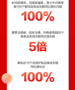 美妆品类中,近10个功效护肤品牌成交额同比增长近100%,抗老功效依然主流,角鲨烷面霜、次抛精华、玻色因精华等8个功效护肤品类成交额同比增长超100%。在15日晚8点的4小时内,美妆全品类成交额整体同比增长超3倍,乳液面霜、礼盒套装、面部精华等多个美妆品类成交额同比增长4倍及以上。