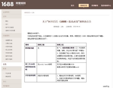 1688平台近日还发布关于“阿里巴巴(1688)隐私政策”调整的公告,为保证用户体验,以及确保用户个人信息以合法方式收集、使用,阿里巴巴(1688)隐私政策作出如下调整。