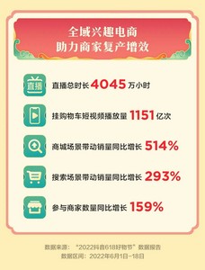 抖音电商发布的“2022抖音618好物节”数据报告显示,6月1日至18日,抖音电商直播总时长达4045万小时,挂购物车的短视频播放了1151亿次。活动期间,抖音商城场景带动销量同比增长514%,搜索场景带动销量同比增长293%,参与活动的商家数量同比增长159%。