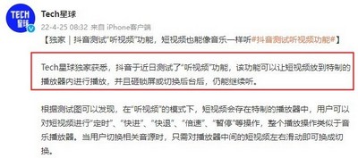 值得一提的是,在完善功能方面,今年4月下旬,抖音还测试“听视频”功能。该功能可以让短视频放到特制的播放器内进行播放,并且在锁屏或切换后台后,仍能继续听。
