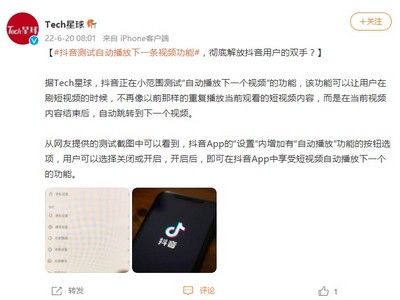 6月20日消息,据Tech星球消息,近日,抖音正在小范围测试“自动播放下一个视频”的功能,该功能可以让用户在刷短视频的时候,不再像以前那样的重复播放当前观看的短视频内容,而是在当前视频内容结束后,自动跳转到下一个视频。
