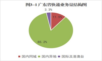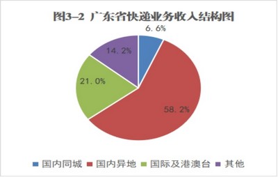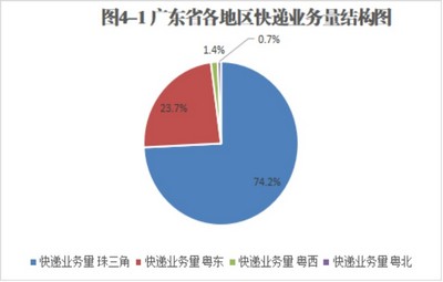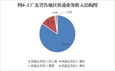 与去年同期相比,珠三角地区快递业务量比重下降了1.6个百分点,快递业务收入比重下降了0.8个百分点;粤东地区快递业务量比重上升了1.4个百分点,快递业务收入比重上升了0.6个百分点;粤西地区快递业务量比重上升了0.2个百分点,快递业务收入比重与上年持平;粤北地区快递业务量比重上升了0.1个百分点,快递业务收入比重上升了0.1个百分点。