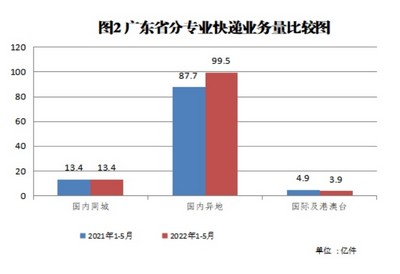 细分业务类别来看,1—5月份,广东省同城业务量累计完成13.4亿件,同比下降0.04%;异地业务量累计完成99.5亿件,同比增长13.5%;国际/港澳台业务量累计完成3.9亿件,同比下降20.1%。