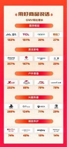 大家电品类中,小米86英寸全面屏电视超越索尼75英寸全面屏成为电视品类GMV第一;华凌、格力、小米成为最受消费者青睐的三大空调品牌;618期间洗衣机GMV前5名中,有4款均为热泵烘干洗烘套装,其中小天鹅全自动滚筒热泵洗烘套装为GMV冠军。