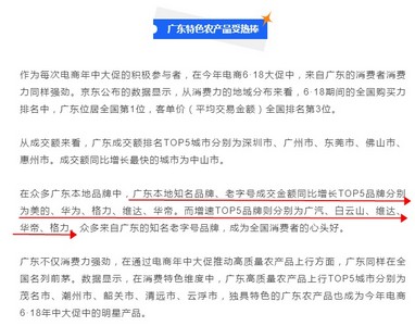 在众多本地品牌中,广东本地知名品牌/老字号成交金额同比增长TOP5分别为:美的、华为、格力、维达、华帝。而增速TOP5则分别为:广汽、白云山、维达、华帝、格力。