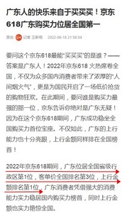 6月19日消息,据报道,2022年京东618期间,在全国31个省/直辖市/自治区购买力排名中,广东位居全国第1位,客单价全国排名第3位,上行金额排名第1位。