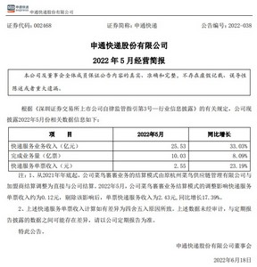 6月20日消息,申通快递股份有限公司(以下简称申通快递或公司)近日发布2022年5月经营简报(以下简称简报)。