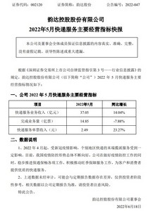 与此同时,韵达发布2022年5月快递服务主要经营指标快报,韵达2022年5月快递产品收入37.05亿元,同比增长14.04%;业务完成量14.85亿票,同比下降7.88%;快递产品单票收入2.49元,同比增长23.27%。
