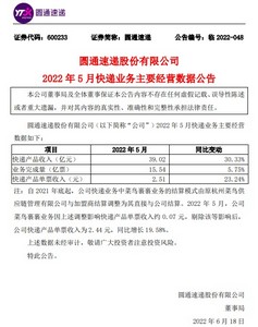 此外,圆通也发布2022年5月快递业务主要经营数据公告,圆通5月快递产品收入39.02亿元,同比增长30.33%;业务完成量15.54亿票,同比增长5.75%;快递产品单票收入2.51元,同比增长23.24%。