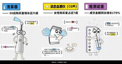 据统计,今年618期间,洗鼻器已经销往全国300多个地级及以上城市(地区),00后购买量增长近6成;血糖监测系统产品(简称CGM)的成交金额有显著增长,女性购买者占近7成;检测试纸成交金额同比增长170%。