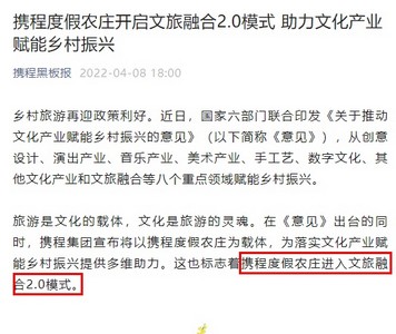 在《意见》出台的同时,携程集团宣布将以携程度假农庄为载体,为落实文化产业赋能乡村振兴提供多维助力。这也标志着携程度假农庄进入文旅融合2.0模式。