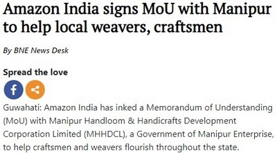值得一提的是,据BUSINESS报道,近日亚马逊印度站与曼尼普尔邦政府(MHHDCL)签署了谅解备忘录,将共同帮助当地工匠和织工成功建立在线业务。