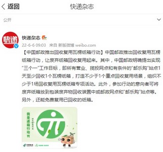 值得一提的是,近日,中国邮政推出回收复用瓦楞纸箱行动,让废弃纸箱回收复用起来。其中,中国邮政明确提出实现“三个一”工作目标,即所有营业、揽投网点和有条件的“邮乐购”站点1天至少回收1个瓦楞纸箱,打造不少于1个重点回收复用场景,组织不少于1场回收复用瓦楞纸箱专项活动。