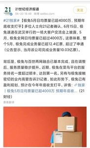 6月21日,据新世纪经济报道援引多方人士消息,6月15日,极兔在武汉举行的一场大客户交流会上披露,5月份极兔全网日均票量已超过4000万。
