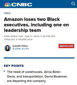 6月22日消息,据CNBC报道,知情人士透露,全球客户履行高级副总裁兼公司领导团队成员艾丽西娅·博勒-戴维斯(Alicia Boler-Davis)和亚马逊运输服务副总裁大卫·波兹曼(David Bozeman)将离开公司,两人都是该公司为数不多的黑人高管。