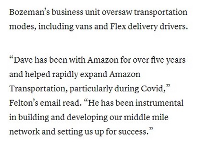 而波兹曼(Bozeman)的业务部门负责监督运输模式。“大卫已经在亚马逊工作了五年多,并帮助亚马逊运输迅速扩张,特别是在疫情期间,”费尔顿的电子邮件中写道,“他在建立和发展‘中间一英里网络’和帮助我们取得成功方面发挥了重要作用。”