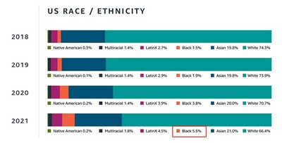 根据公司数据,亚马逊近年来在其高管层的多元化方面取得了一定进展,但截至2021年底,其高级领导者中仍然只有5.5%是黑人。