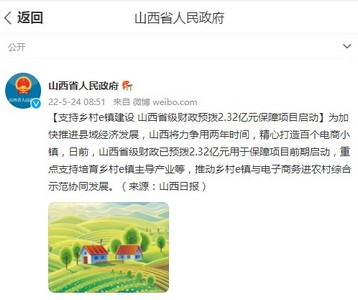 另据了解,为加快推进县域经济发展,山西将力争用两年时间,精心打造百个电商小镇,目前,山西省级财政已预拨2.32亿元用于保障项目前期启动,重点支持培育乡村e镇主导产业等,推动乡村e镇与电子商务进农村综合示范协同发展。