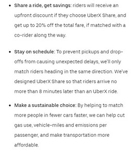 Uber表示,选择拼车的乘客将获得预付折扣。如果他们在路上与另一位乘客同乘,可以获得高达20%的总车费折扣。Uber将拼车服务的乘客数量限制为2人。Uber还承诺,拼车乘客到达的时间,不会比个人独自打车晚8分钟以上。
