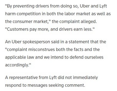 起诉书称:“通过阻止司机这样做,Uber和Lyft损害了劳动力市场和消费市场的竞争,导致消费者付的钱更多,司机赚的钱更少。”