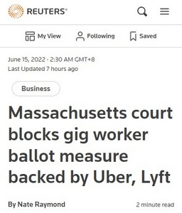 上周,马萨诸塞州最高法院驳回了一项提案,其内容是让选民对是否应该将基于应用的拼车和送货司机视为独立承包人而非员工这一问题进行投票。对Uber和Lyft等拼车公司来说,这项提案被驳回是个挫折。