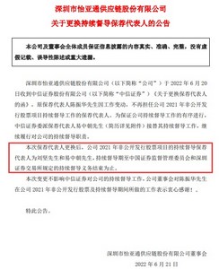 6月22日消息,深圳市怡亚通供应链股份有限公司(以下简称怡亚通或公司)日前发布关于更换持续督导保荐代表人的公告(以下简称公告)。