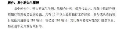 简历显示,易中朝先生现任中信证券投资银行管理委员会副总裁,具有10年以上投资银行工作经验,参与或负责的项目包括共进股份IPO项目、鲁亿通IPO项目、艾比森向特定对象发行股票项目、怡亚通非公开发行项目等。