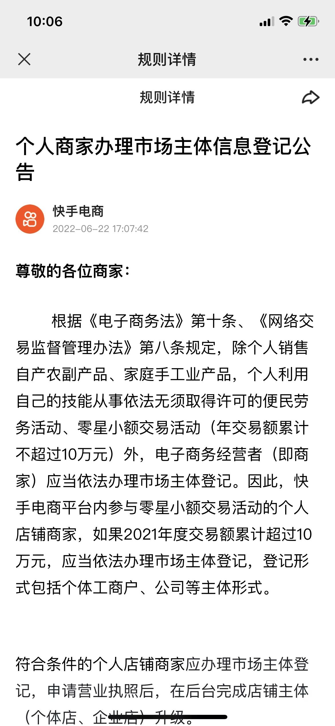 公告称,根据《电子商务法》第十条、《网络交易监督管理办法》第八条规定,除个人销售自产农副产品、家庭手工业产品,个人利用自己的技能从事依法无须取得许可的便民劳务活动、零星小额交易活动(年交易额累计不超过10万元)外,电子商务经营者(即商家)应当依法办理市场主体登记。因此,快手电商平台内参与零星小额交易活动的个人店铺商家,如果2021年度交易额累计超过10万元,应当依法办理市场主体登记,登记形式包括个体工商户、公司等主体形式。