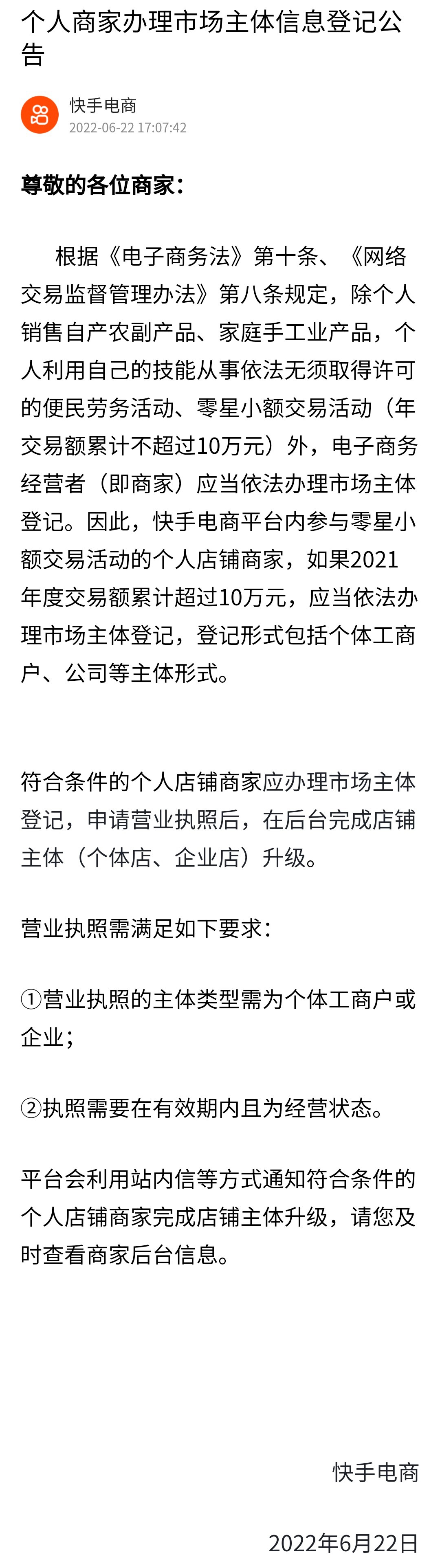 快手电商 符合条件的个人店铺商家应办理市场主体登记