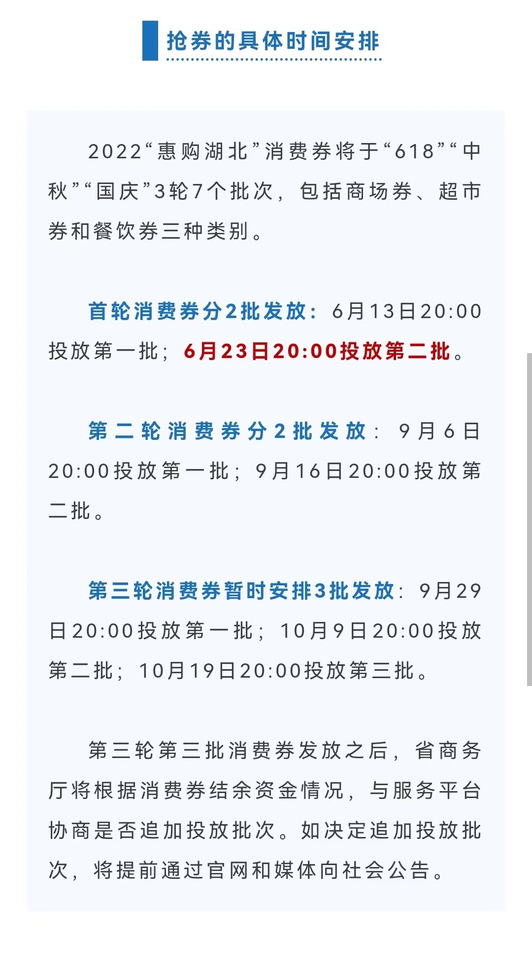 此次消费券计划2022年6月至10月,分“凤鸣楚天·夏至有约”、“凤鸣楚天·欢乐暑假”、“凤鸣楚天·喜庆丰收”3个阶段共计9个批次投放。首批消费券将于6月23日20:00至6月30日在携程、同程、游湖北平台、云闪付4家平台正式投放,首批计划补贴额度超过2000万元。