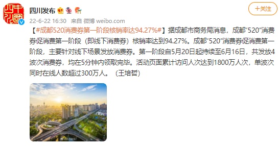 成都“520”消费券第一阶段核销率达94.27%