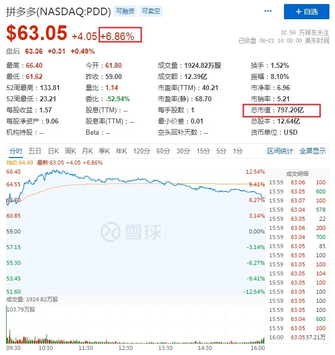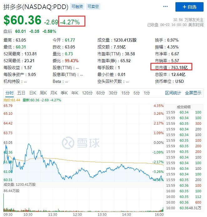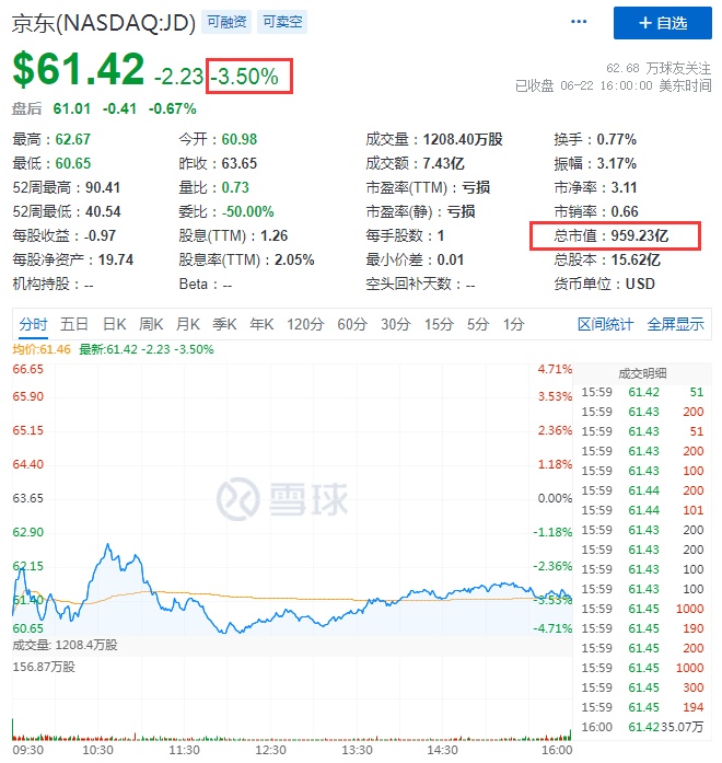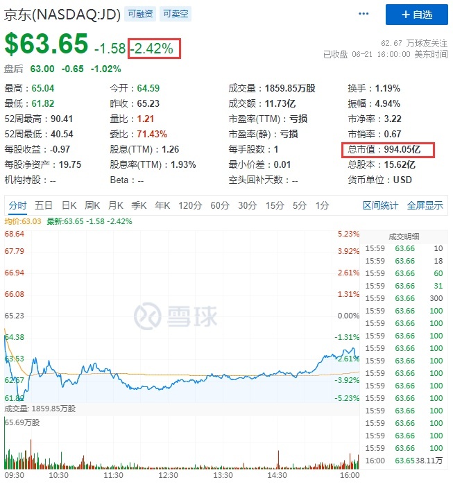 同时,寺库跌近9%,京东、新东方、万物新生跌超3%,京东报63.65美元,总市值994.05亿美元。