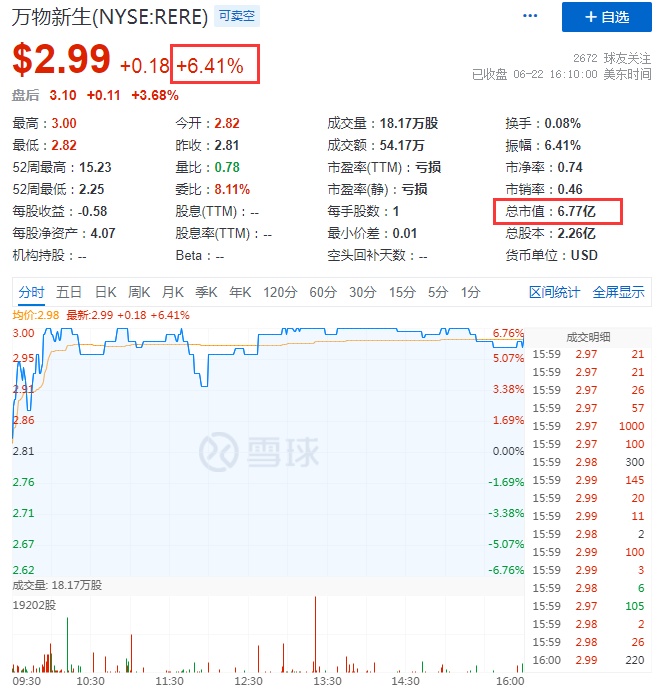 6月23日消息,热门中概股周三收盘涨跌不一。其中,优信涨近15%,万物新生涨超6%,报2.99美元,总市值6.77亿美元,逸仙电商涨超2%,中通涨超1%,报24.51美元,总市值198.47亿美元。
