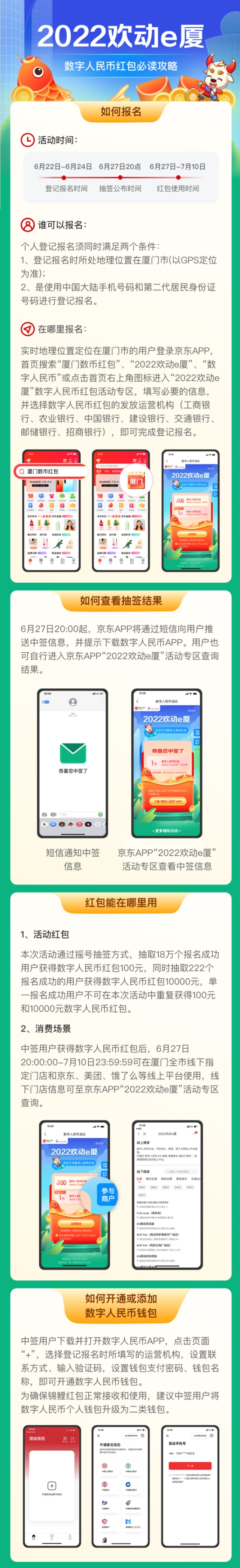 据了解,实时地理位置定位在厦门市的用户登录京东APP,首页搜索“厦门数币红包”、“2022欢动e厦”、“数字人民币”或点击首页右上角图标进入“2022欢动e厦”数字人民币红包活动专区,填写必要的信息,并选择数字人民币红包的发放运营机构(工商银行、农业银行、中国银行、建设银行、交通银行、邮储银行、招商银行),即可完成登记报名。